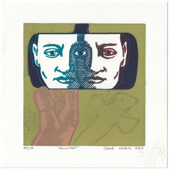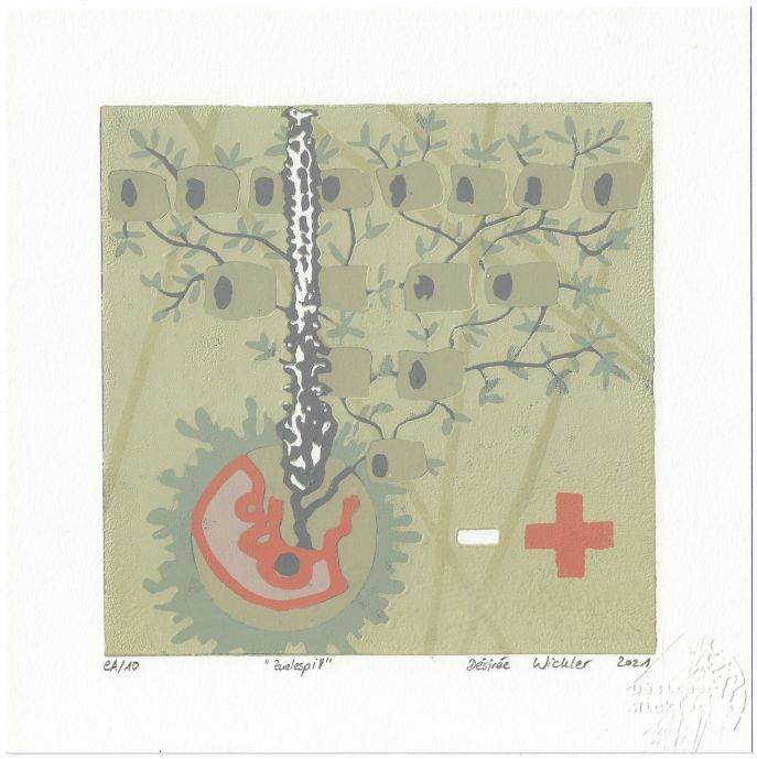 Linolschnitt (verlorene Form) auf cremefarbenem Papier