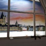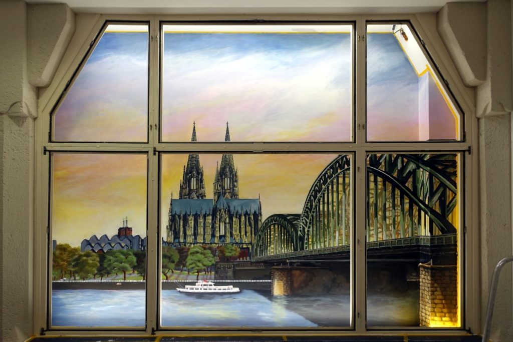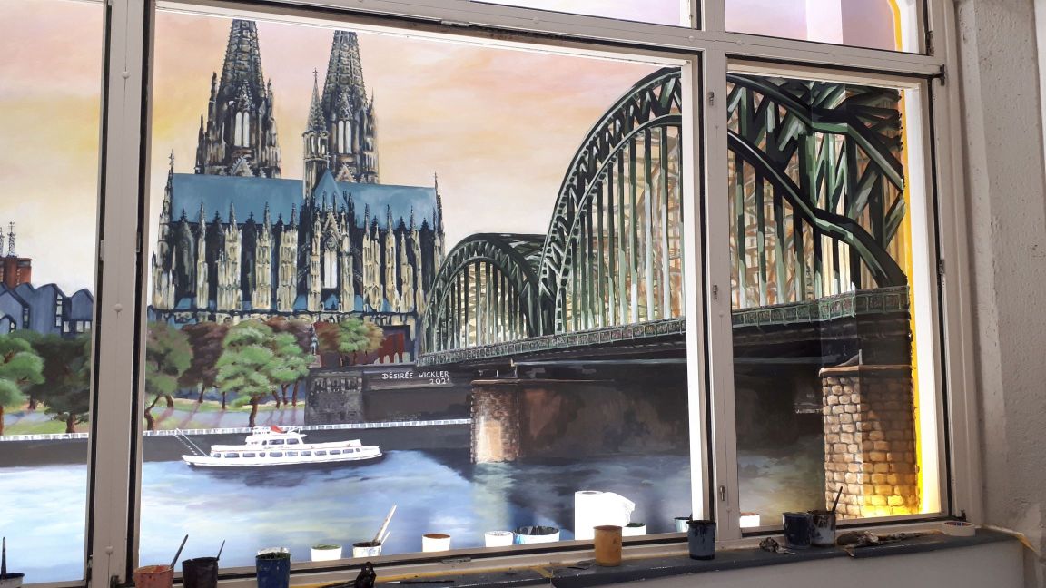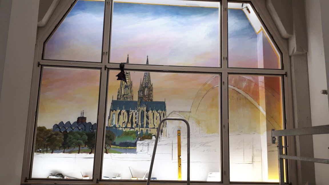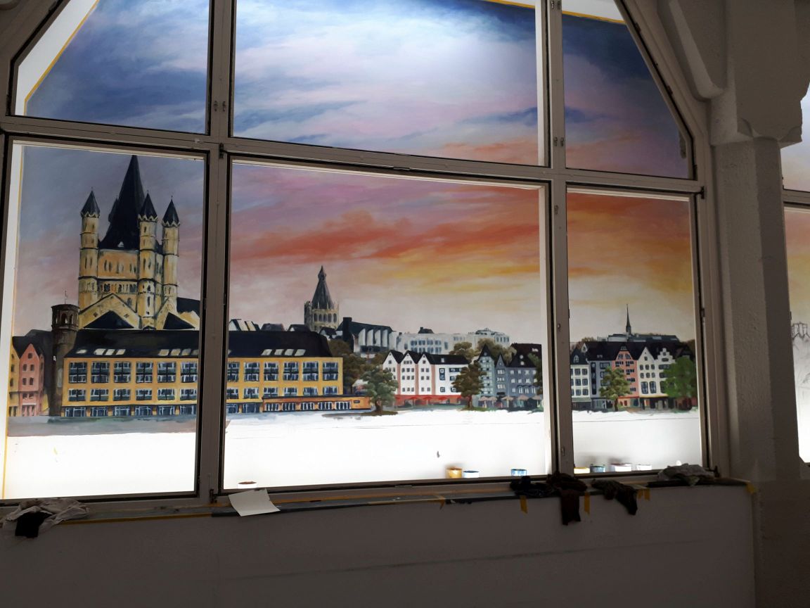 Im St. Antonius Krankenhaus entstand im Januar bis Februar 2021 dieses großformatige Kölner Panorama (etwa 8 x 2,5 m). Die Fenster stehen unter Denkmalschutz und beim Anbau der neuen Intensivstation blieb der Blick auf eine graue Wand. Diese direkt durch die Fensterrahmen zu bemalen und das passende Licht auszusuchen war eine ziemliche Herausforderung, die monatelange Vorbereitung erforderte. Hier ein paar Eindrücke vom Entstehungsprozess von den ersten Farbstudien zum meterhohen Gesamtkunstwerk.