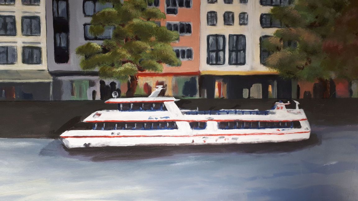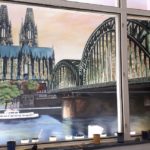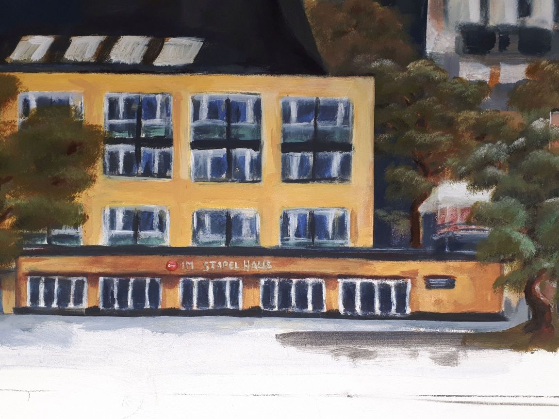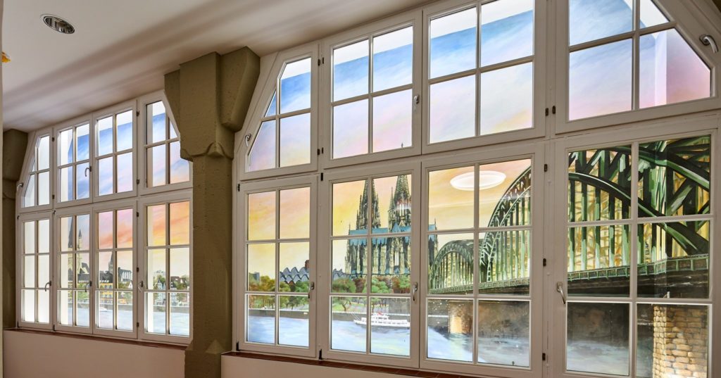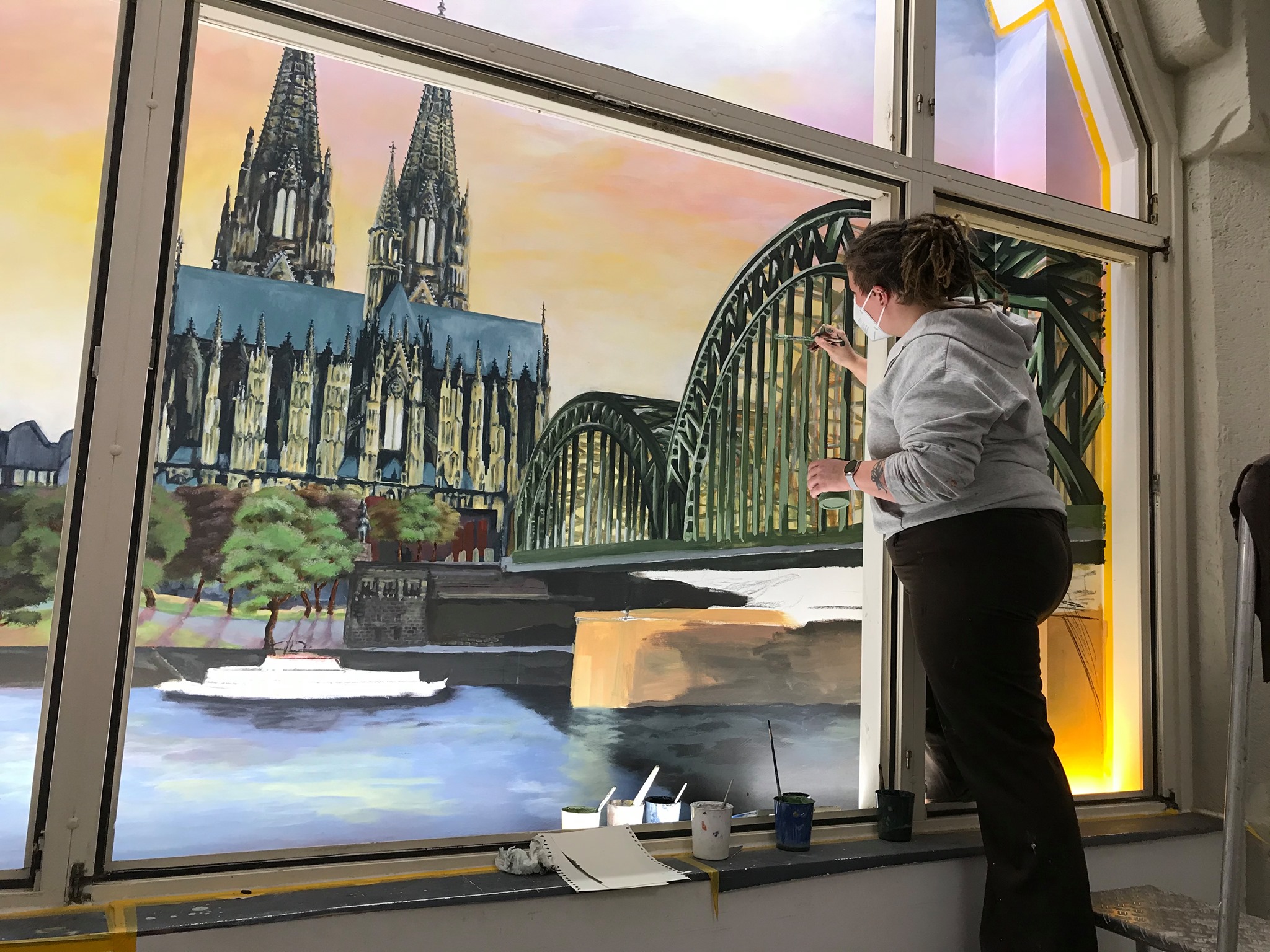 Im St. Antonius Krankenhaus entstand im Januar bis Februar 2021 dieses großformatige Kölner Panorama (etwa 8 x 2,5 m). Die Fenster stehen unter Denkmalschutz und beim Anbau der neuen Intensivstation blieb der Blick auf eine graue Wand. Diese direkt durch die Fensterrahmen zu bemalen und das passende Licht auszusuchen war eine ziemliche Herausforderung, die monatelange Vorbereitung erforderte. Hier ein paar Eindrücke vom Entstehungsprozess von den ersten Farbstudien zum meterhohen Gesamtkunstwerk.