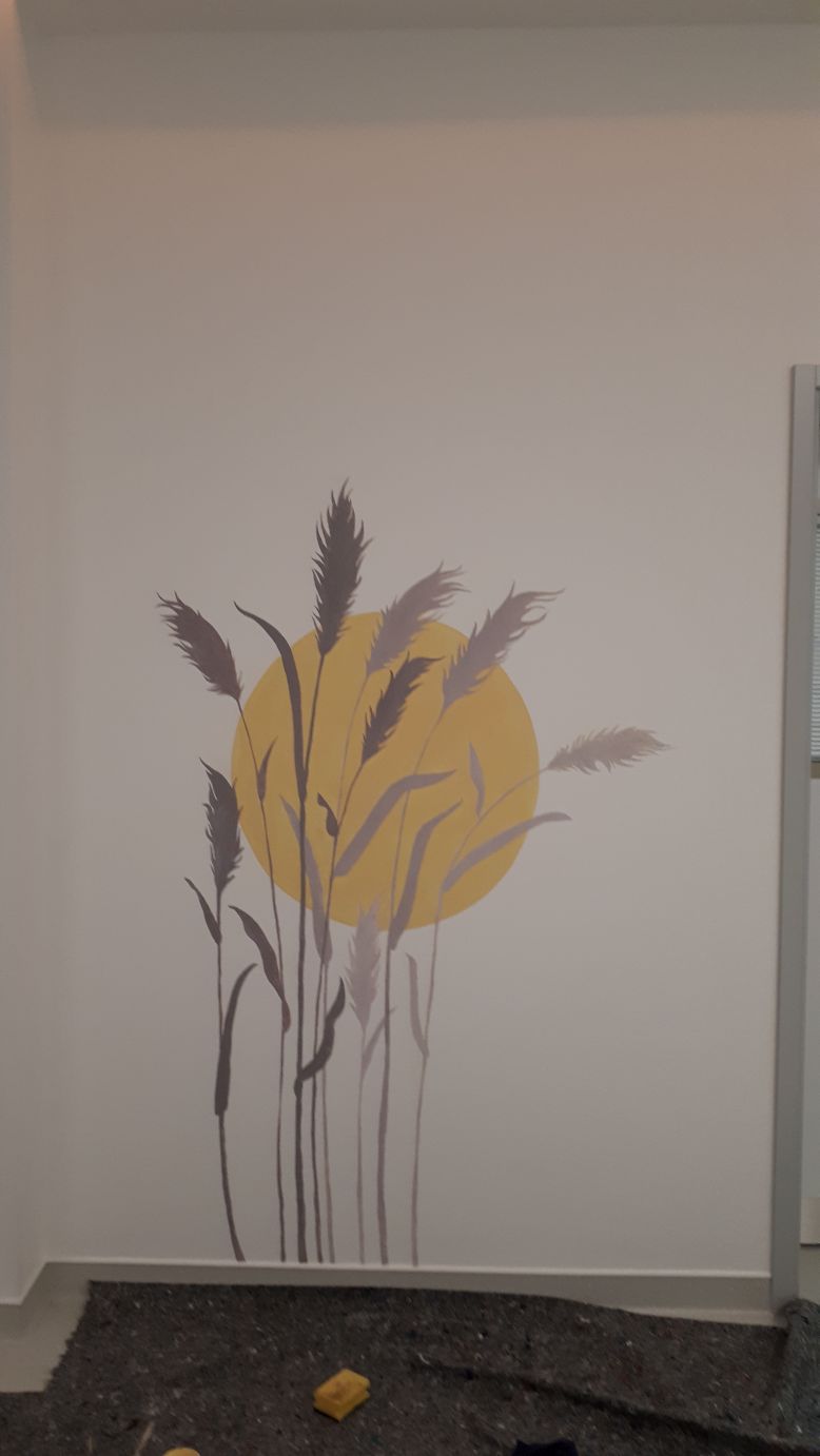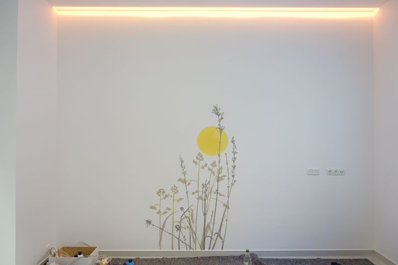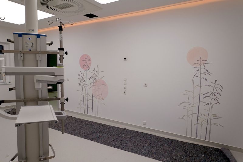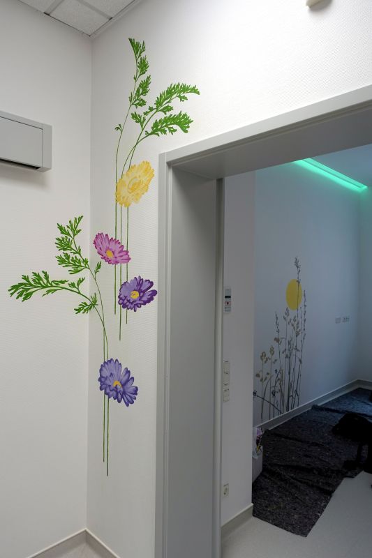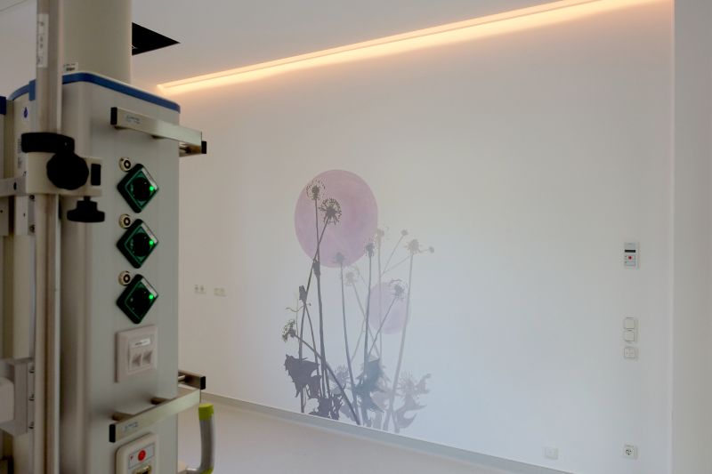 Für die neue Intensivstation im St. Antonius Krankenhaus in Köln wurden dezente florale Wandmalereien angefertigt. Durch das spezielle Licht, welches Tag und Nacht simuliert, entstand der Anspruch, dass Patient*innen beim Aufwachen eine beruhigende, grafische Landschaftselemente erblicken. Diese sind in verschiedenen Grautönen mitgestaltet um sich der jeweiligen Lichtsituation anpassen zu können.