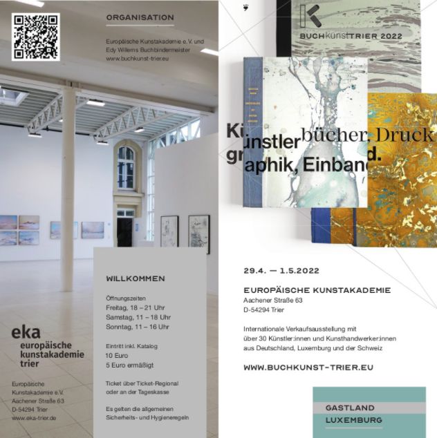 Vom 28. April bis 1. Mai 2022 gibt es für Bibliophile und Graphiksammler:innen eine neue Veranstaltung in Trier zu entdecken. In der lichtdurchfluteten Kunsthalle Trier der Europäischen Kunstakademie zeigen professionelle Künstler:innen und Kunsthandwerker:innen ihre einzigartigen Arbeiten. Aus den Bereichen Holzschnitt und Radierung, Kalligraphie, Graphik und Illustration, Papier und Bucheinband sind vielfältige Werke zu sehen. Eingeladen sind Schaffende aus dem Gastland Luxemburg, aus Deutschland und der Schweiz.
