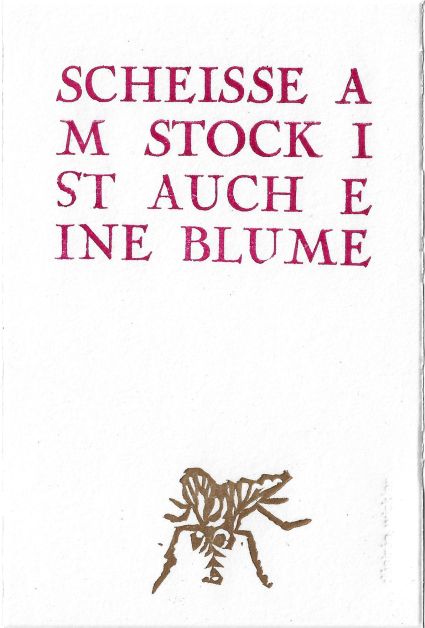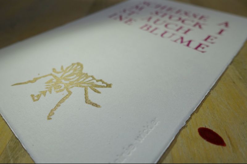 Linolschnittdruck in gold und Bleisatz in tiefpink auf hochwertigem Büttenpapier (300 g/m²).