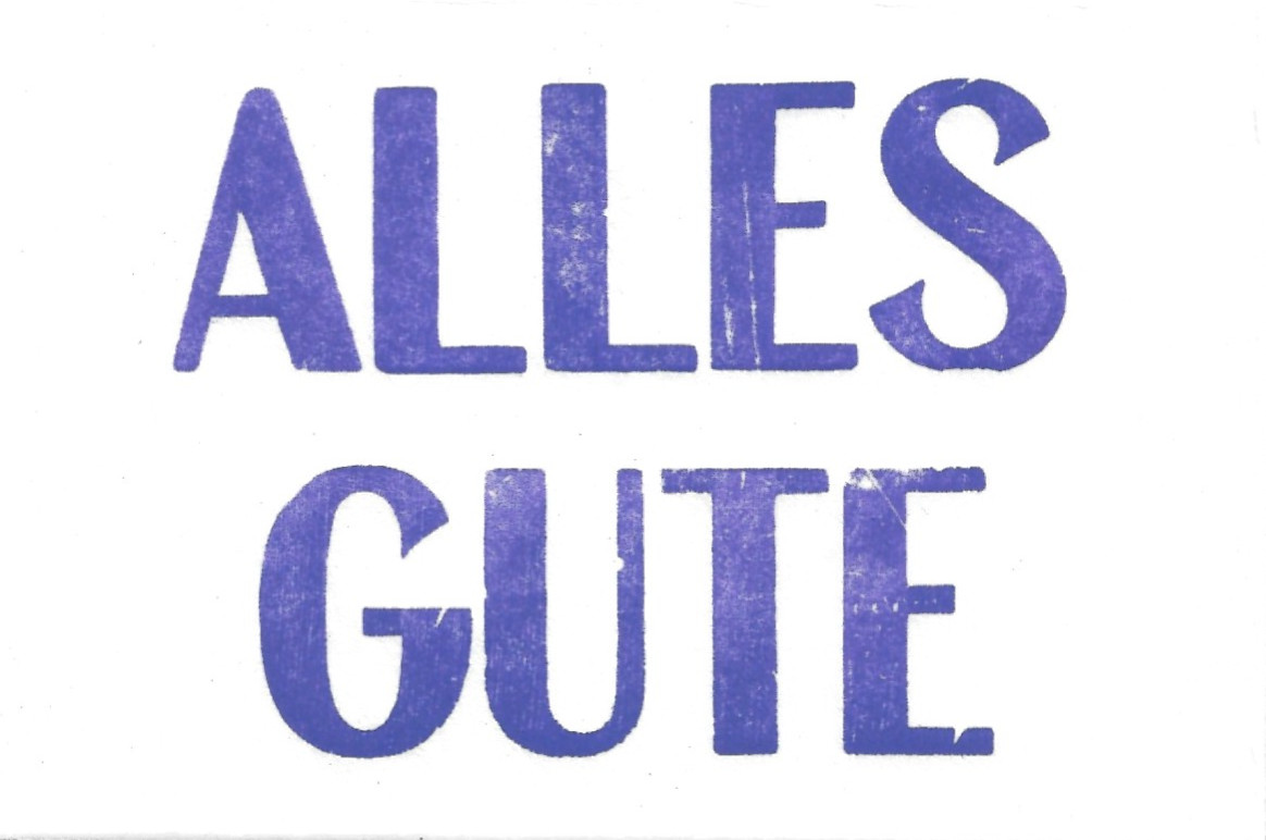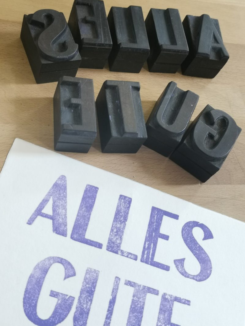 Handgedruckter Holzbuchstabendruck „ALLES GUTE“ in violett auf hochwertigem Büttenpapier. Rückseite Bleisatz “SCHMETTERPRESS x désirée wickler”. Größe: 15 x 10 cm