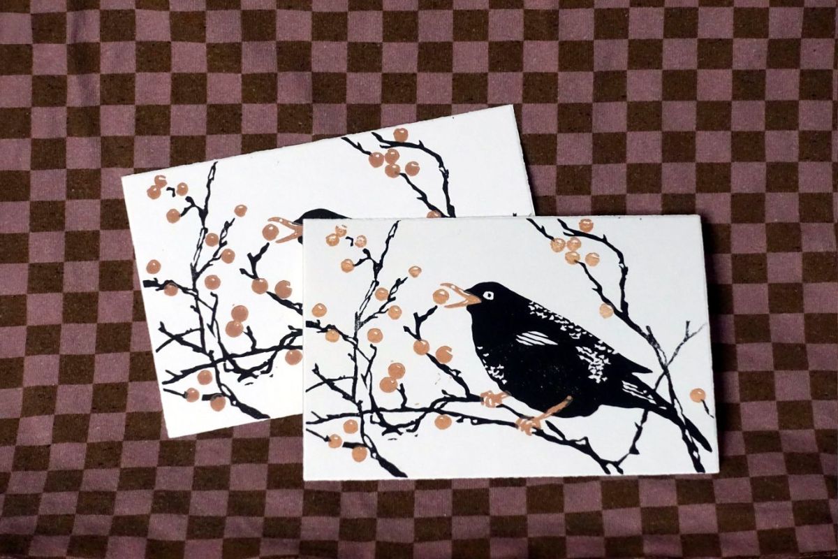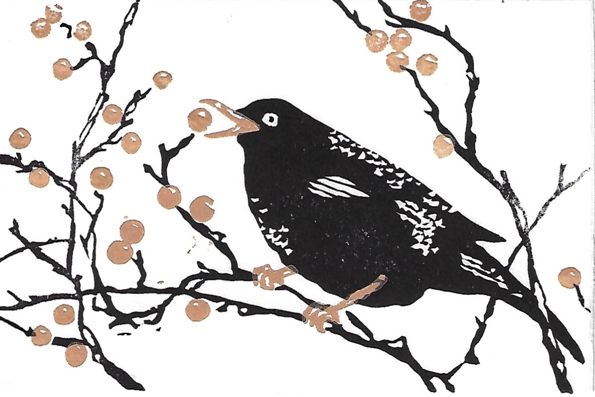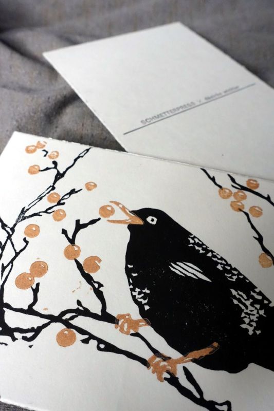 Zweifarbiger Linolschnittdruck in altrosa und schwarz auf hochwertigem Büttenpapier (300 g/m²). Rückseite: Bleisatz “SCHMETTERPRESS x désirée wickler”.