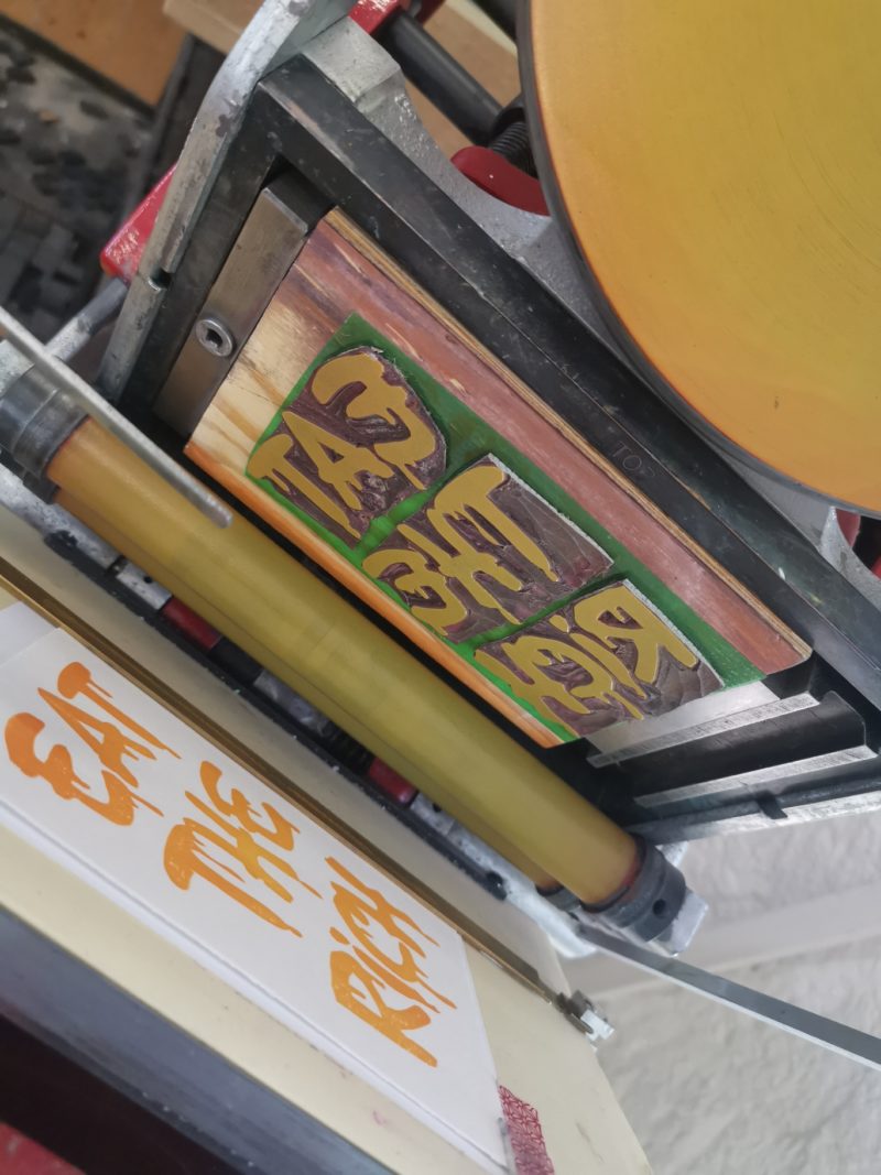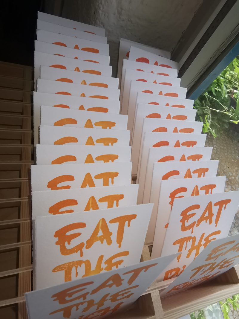 Handgedruckter Linolschnitt „eat the rich“ in dunkelgelb auf hochwertigem Büttenpapier. Rückseite Bleisatz “SCHMETTERPRESS x désirée wickler”. Größe: 15 x 10 cm