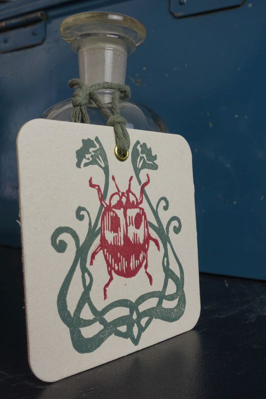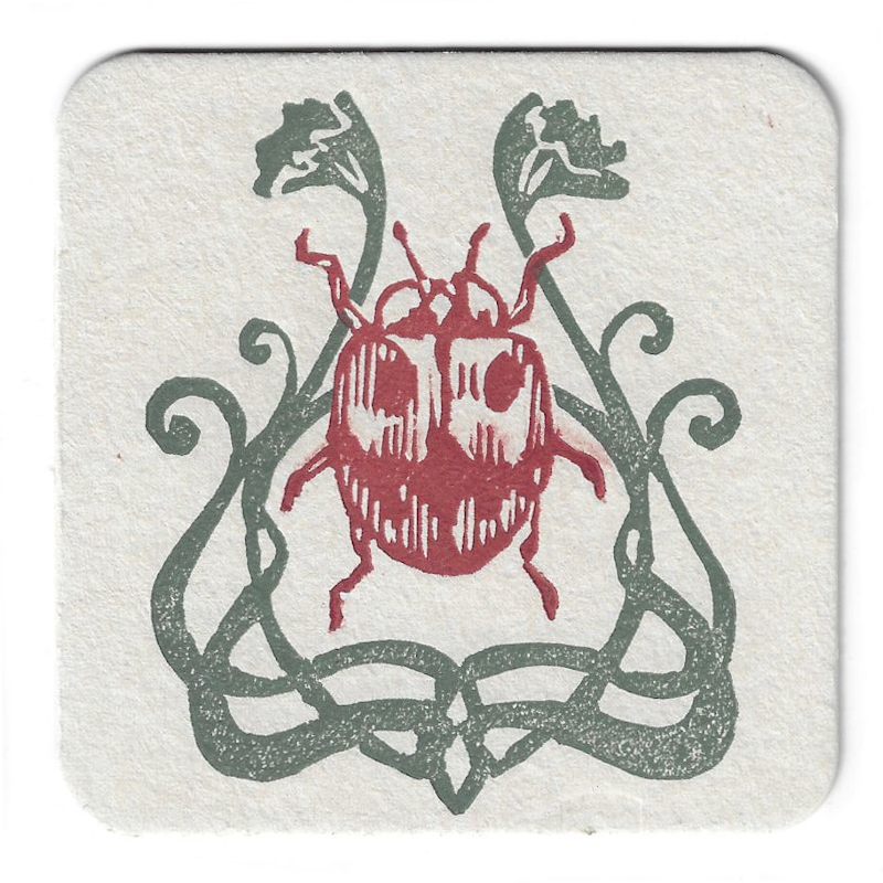 Zweifarbiger Linolschnitt in krapprot und waldgrün. Bierfilz (9,3 x 9,3 cm mit abgerundeten Ecken, 600g/m² gelblichweiß).