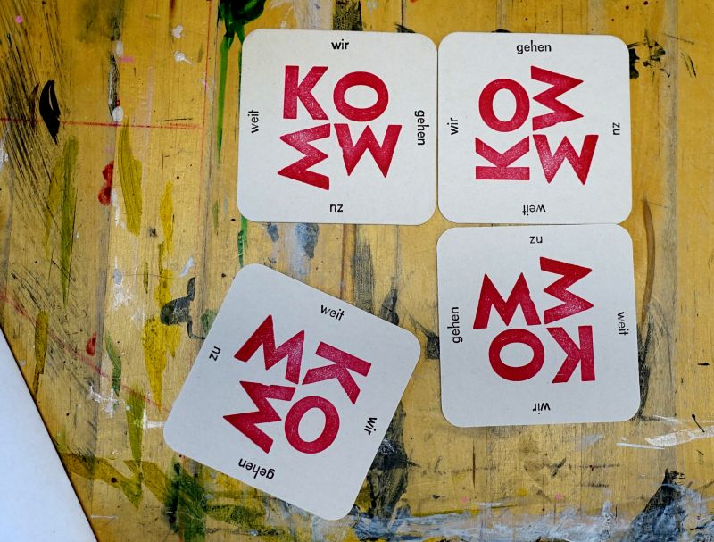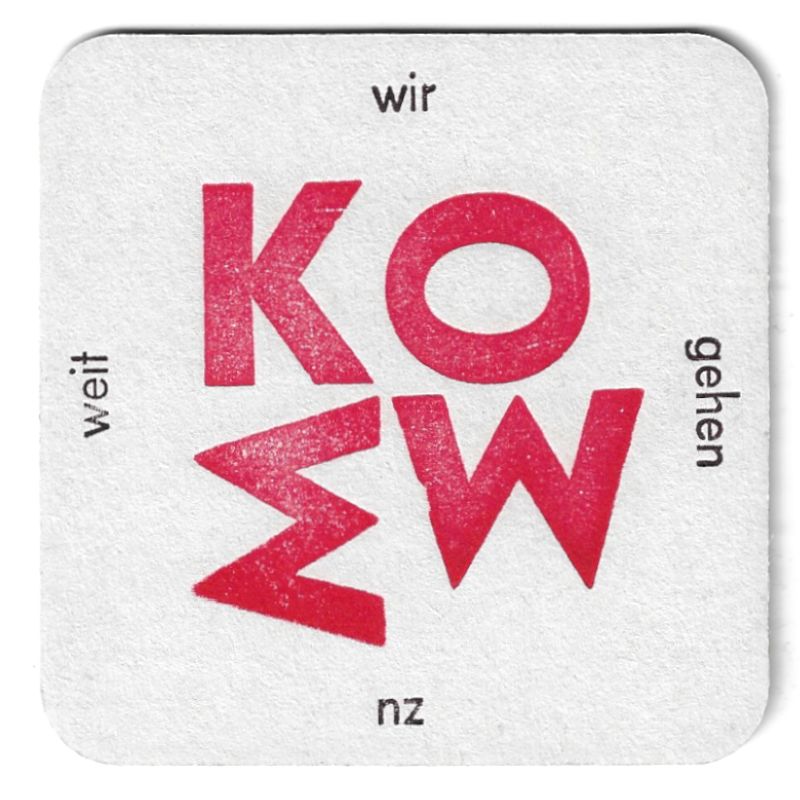 Dunkelroter Holzbuchstabendruck und schwarzer Bleisatzdruck (Bauer 20 pt). Bierfilz (9,3 x 9,3 cm mit abgerundeten Ecken, 600g/m² gelblichweiß).