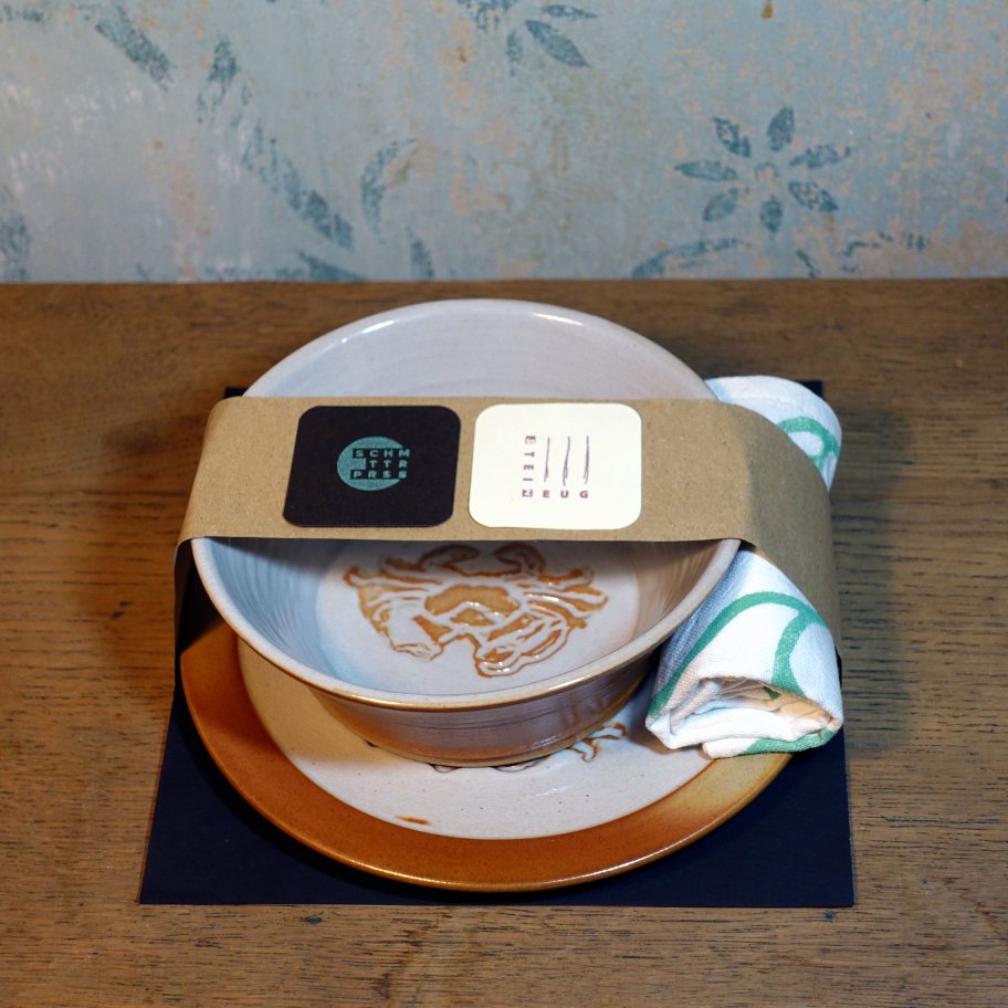 Farbliche Abweichungen zur Bildschirmwiedergabe können auftreten.Handbedruckte Serviette Krabbe von SCHMETTERPRESS mit einer Müslischale und Frühstücksteller, beides mit Krabbenmotiv, von STEINZEUG – auf Anfrage!