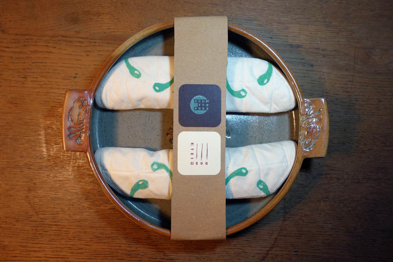 Handbedruckte cremefarbene Topflappen mit mintgrünen Algen von SCHMETTERPRESS und eine Auflaufform mit Krabbenmotiv von STEINZEUG – auf Anfrage!