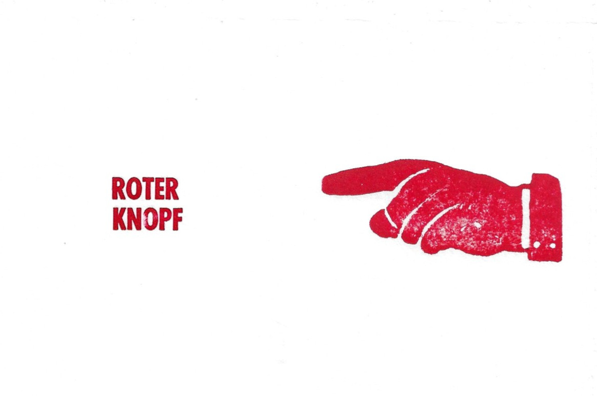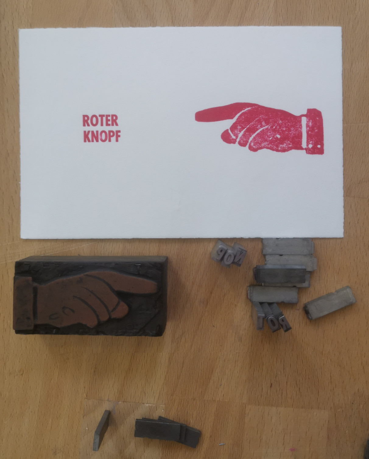 Handgedruckter Bleisatz „ROTER KNOPF“ und Holzklischee in rot auf hochwertigem Büttenpapier.