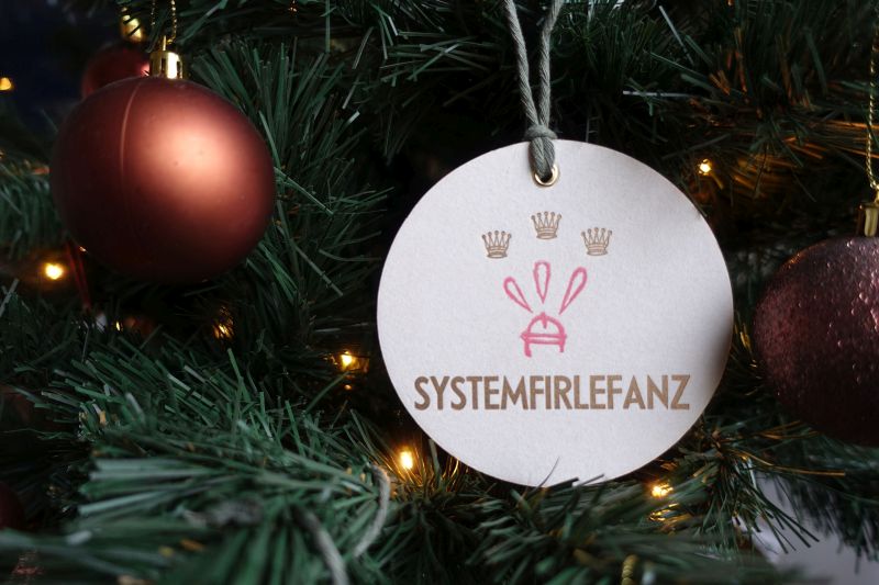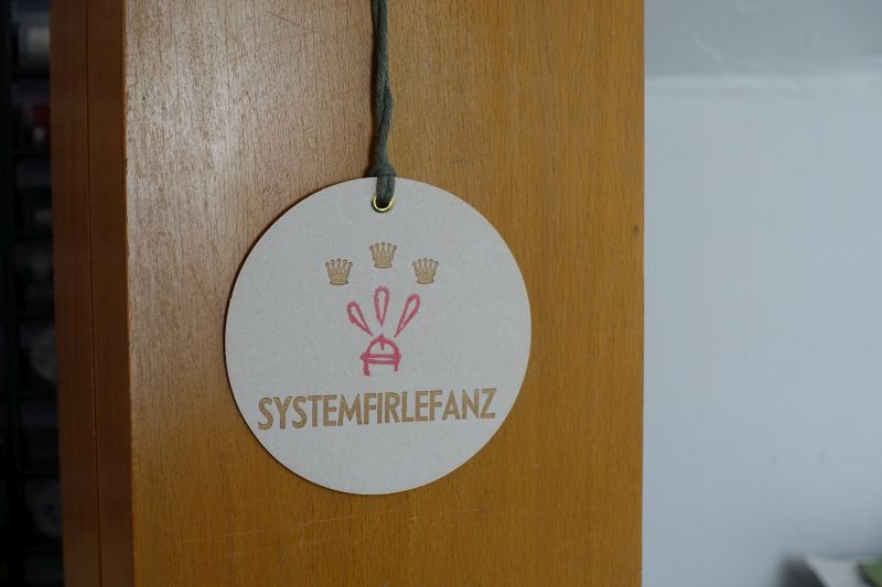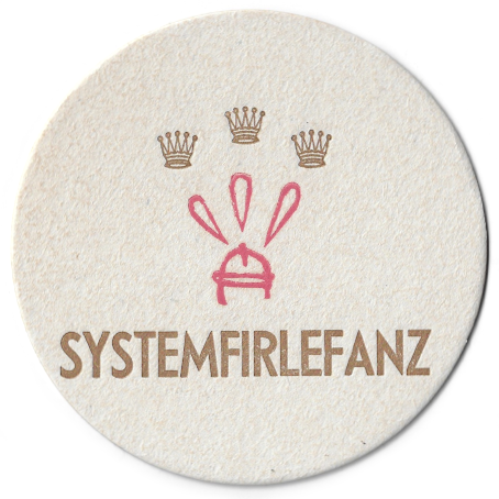 Bleisatz „Systemfirlefanz“ und 3 Kronen in Gold, Symbol (Linolschnitt) in Dunkelrosa. Bierfilz (rund, Durchmesser 107mm, 600g/m² gelblichweiß).