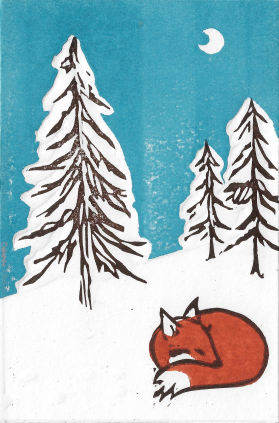 Linolschnittdruckdruck in mittelblau, rostbraun und sepia. Der Schnee dieser stillen Nacht und die Pfotenabdrücke des Fuchses sind blind geprägt.