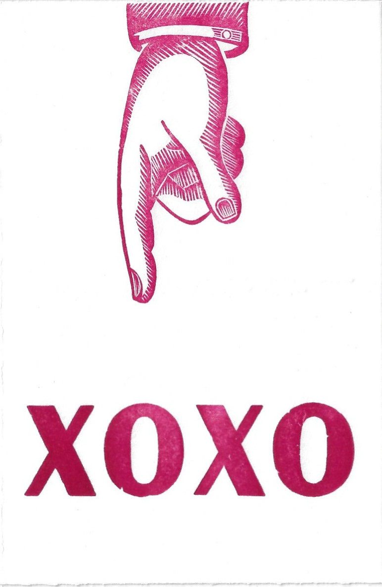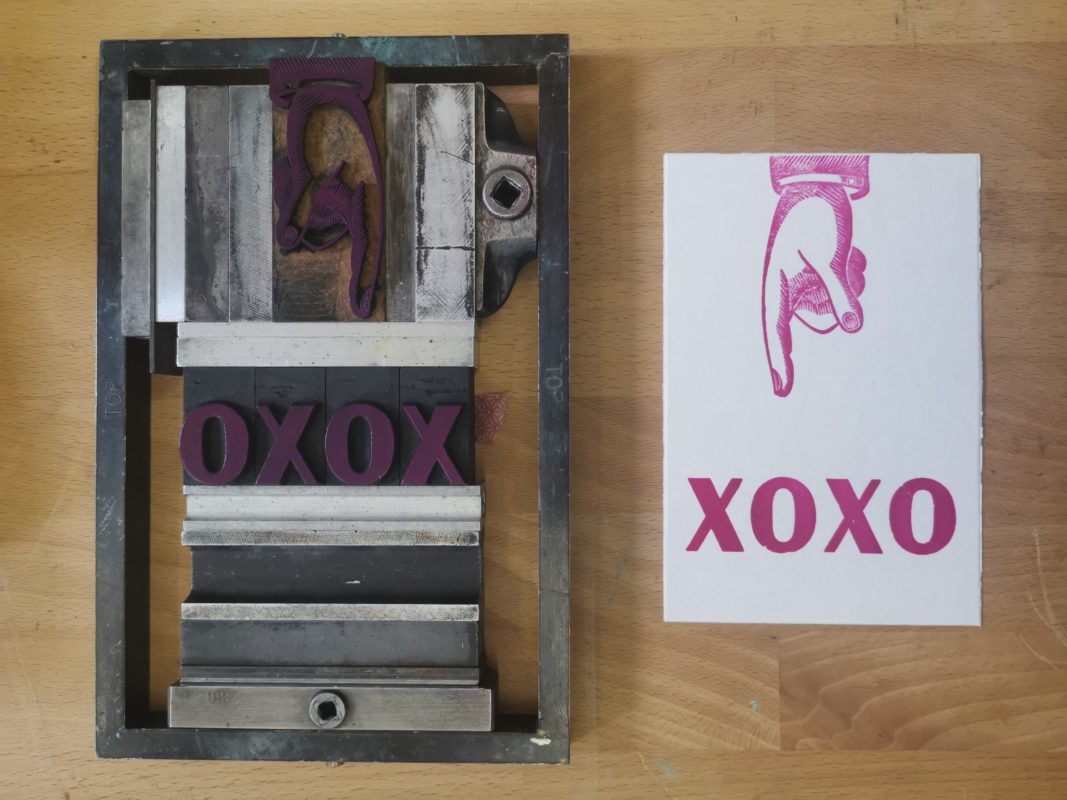 Handgedruckte Holzbuchstaben „xoxo“ und Holzdruckstock in pink auf hochwertigem Büttenpapier. Rückseite Bleisatz “SCHMETTERPRESS x désirée wickler”. Größe: 15 x 10 cm