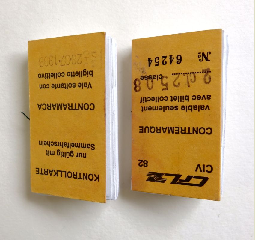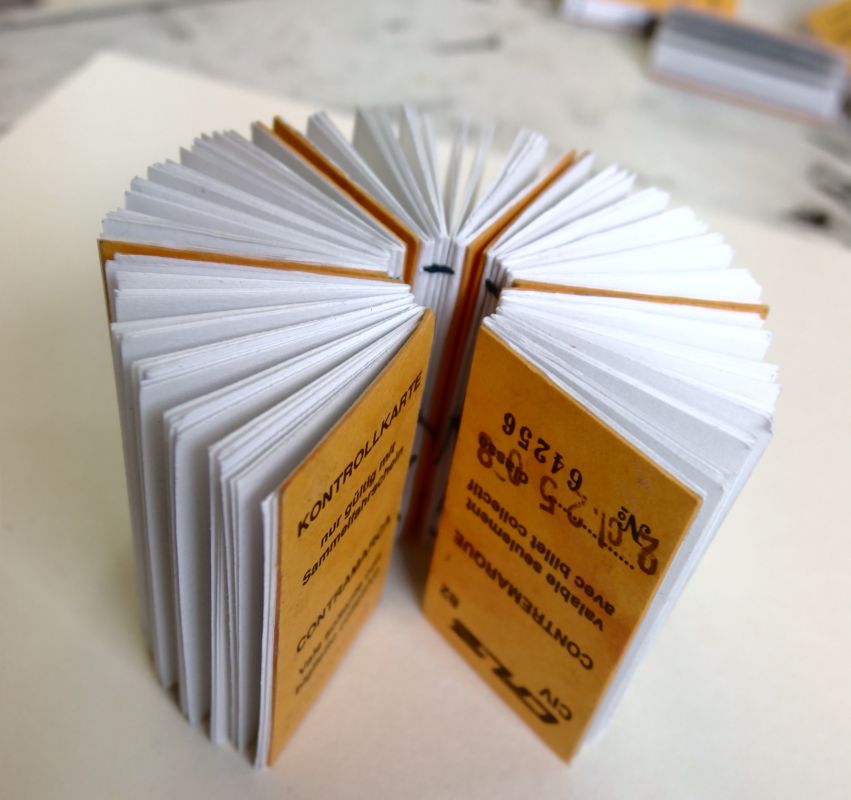 Farbliche Abweichungen zur Bildschirmwiedergabe können auftreten.Ein kleines handgebundenes Büchlein mit offenem Rücken. Alte Zugfahrkarten aus Luxemburg wurden hier als Buchdeckel eingesetzt. Verwendete Materialien: Bütte, hohe Grammatur, geeignet für Tusche, Filzstift, Bleistift.. Maße: 6 x 2,5 cm / Höhe: 0,6 cm.